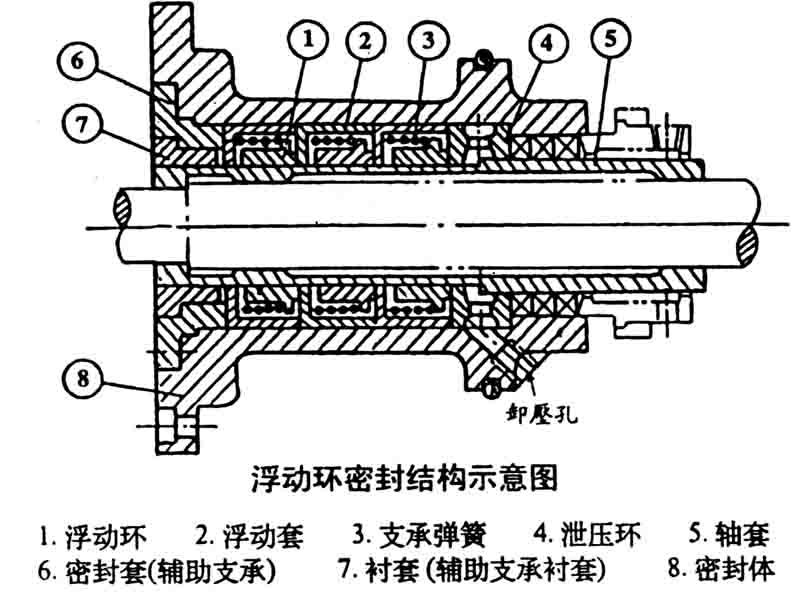 套外圓表面與浮動(dòng)環(huán)內(nèi)圓表面形成的狹窄縫隙,以產(chǎn)生節(jié)流來(lái)達(dá)到的。浮動(dòng)環(huán)與軸套之間的縫隙大小及長(zhǎng)度,是影響泄漏量的重要因素。在密封室外面有冷卻腔,通人工業(yè)水進(jìn)行冷卻。在密封室的外側(cè)端,設(shè)有卸壓孔,必須將從浮動(dòng)環(huán)外面的卸壓孔泄出的液體接到低壓區(qū)去,(可以排走,也可以接到開(kāi)啟式冷卻水池回用)這才能使密封縫隙起到節(jié)流作用。卸壓孔不能堵塞,也不能將泄漏量調(diào)節(jié)得過(guò)小,否則會(huì)使密封腔壓力提高,損壞密封,造成事故。 R型浮動(dòng)環(huán)密封設(shè)有二個(gè)卸壓孔;VD型(用于80R-60和150R-56)浮動(dòng)密封設(shè)有一個(gè)卸壓孔。二孔結(jié)構(gòu)為冷卻水通道,上部孔為冷卻水進(jìn)口,下部孔為水汽混合液排泄孔,由用戶自行接裝進(jìn)出管路,并在排出管路上裝一只3/8”旋塞,以控制密封室的泄漏量。一孔結(jié)構(gòu)僅為排泄孔之用,接裝方法與二孔結(jié)構(gòu)的排泄孔接裝要求相同。冷卻液必須使用軟水,以防結(jié)垢。 |