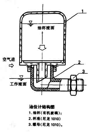 油泵的軸承托架上,都采用了油位計裝置,在正常供油的情況下,能始終保持油位面的恒定不變。油位計的結構見示意圖。