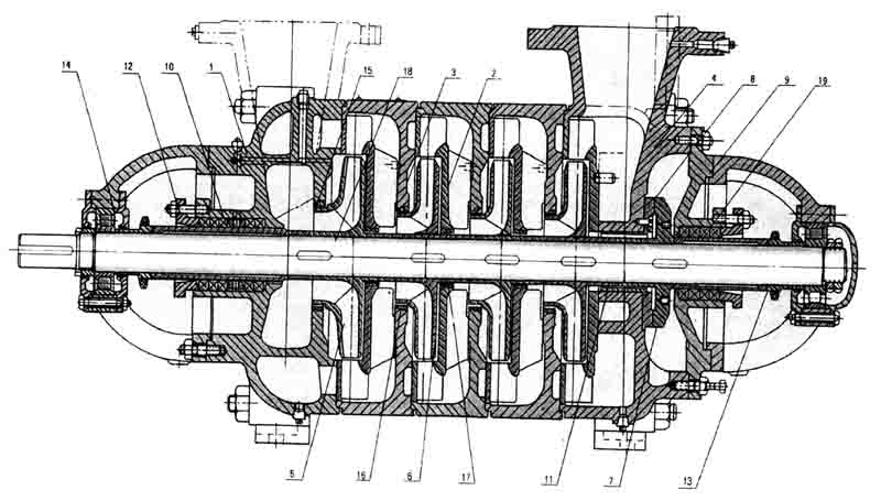 14、軸承 15、首級密封環(huán) 16、密封環(huán) 17、導(dǎo)葉套 18、軸 19、軸套